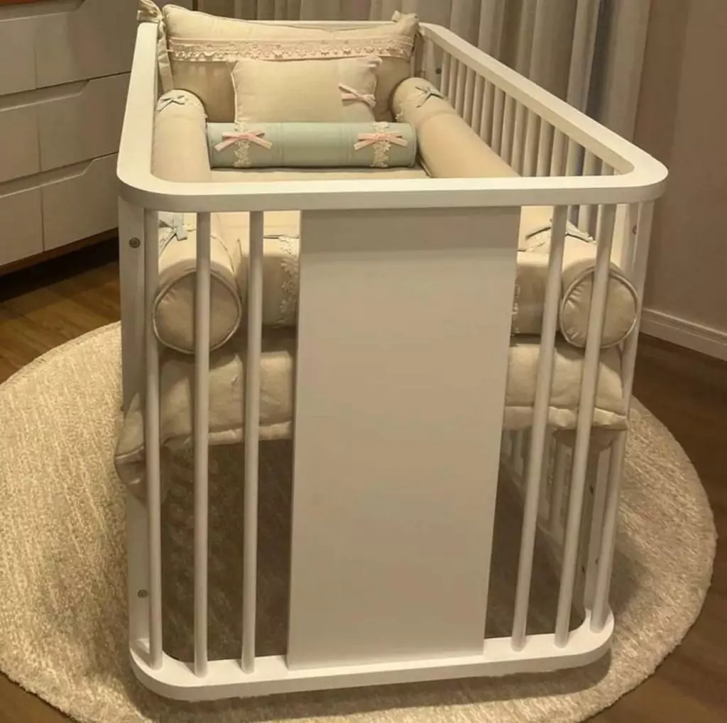 O berço Kin possui uma estrutura sólida e segura, com grades laterais fixas que garantem a proteção do bebê durante o sono.