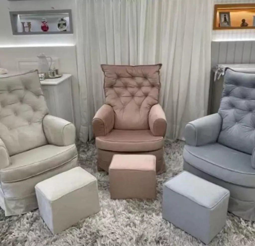 A poltrona Rebeca é uma poltrona balanço e giratória , e acompanha Puff .